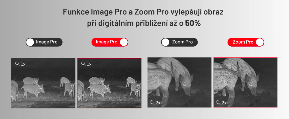 Pro ještě kvalitnější obraz přicházejí funkce Image Pro a Zoom Pro, které až o 50% vylepšují obraz při digitálním přiblížení. Pokročilé technologie zpracování obrazu přináší čistší a detailnější obraz vykreslený na displeji OLED s rozlišením 1024 × 768 px.