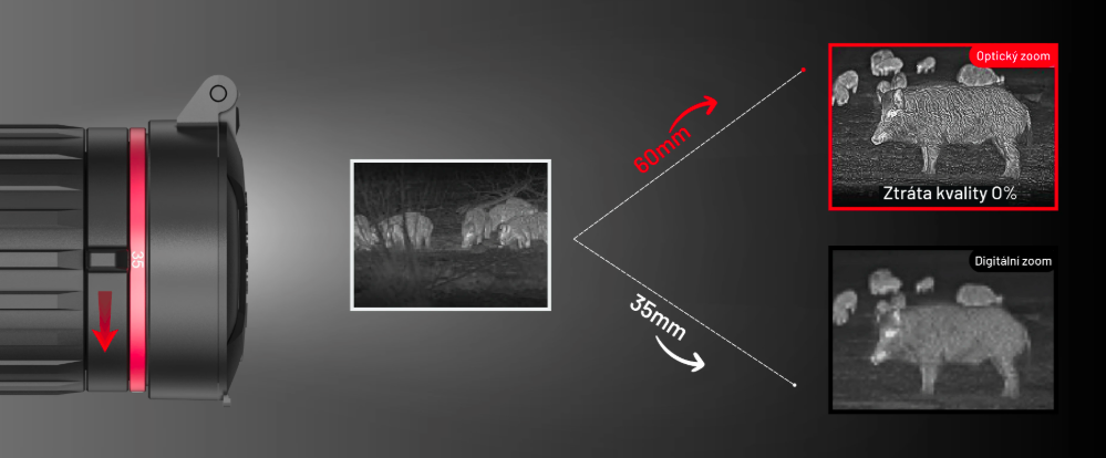 Funkce optického zoomu spočívá ve dvou čočkách v jednom přístroji, díky kterým si můžete měnit šíři zorného pole dle Vaší potřeby. Čočka s ohniskovou vzdáleností 35 mm s pevným optickým zvětšením 1,8x dává zaměřovači možnost detekce na 1800 metrů a čočka s ohniskovou vzdáleností 60 mm se zvětšením 3,1x až na 3000 metrů.